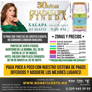 Grupo B-ONE Espectáculos anuncia esta gran gala internacional, el Tour “50 Años” de Guadalupe Pineda el sábado 3 de mayo a partir de la 21:00 horas en la majestuosa y acústica Sala TLAQNÁ de Xalapa.