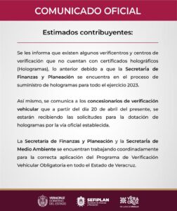 “Se les informa que existen algunos verificentros y centros de verificación que no cuentan con certificados holográficos (Hologramas), lo anterior debido a que la Secretaria de Finanzas y Planeación se encuentra en proceso de suministro de hologramas para todo el ejercicio 2023”.