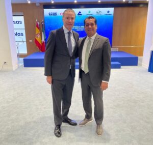 El diputado federal veracruzano y su esposa, la diputada Diana Karina Barreras Samaniego, presidenta del Congreso de Sonora, asisten como invitados especiales a la I Edición del Foro Empresarial “México y España una apuesta empresarial de futuro” al que también acuden el embajador mexicano, Quirino Ordaz, dirigentes de organismos empresariales y sus contrapartes españolas.